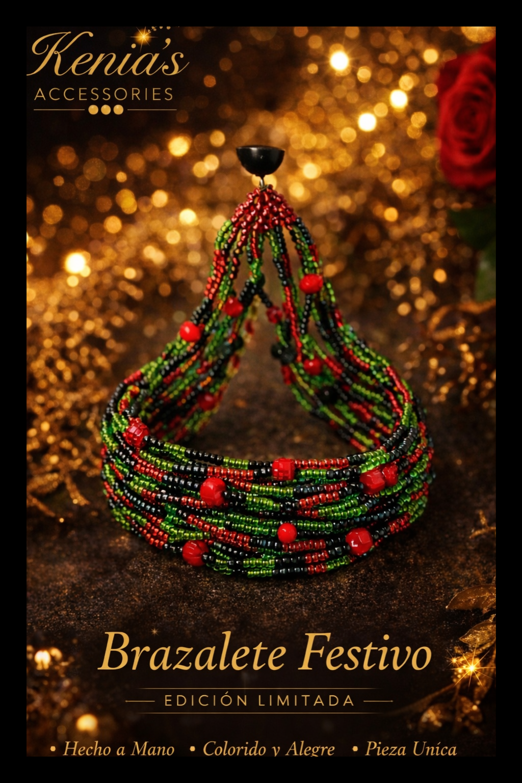 Ein farbenfrohes und ausdrucksstarkes Armband, das Lebensfreude und Eleganz vereint. Dieses handgefertigte Schmuckstück besticht durch seine harmonische Kombination aus roten, grünen und schwarzen Perlen, die Bewegung, Energie und Stil symbolisieren.