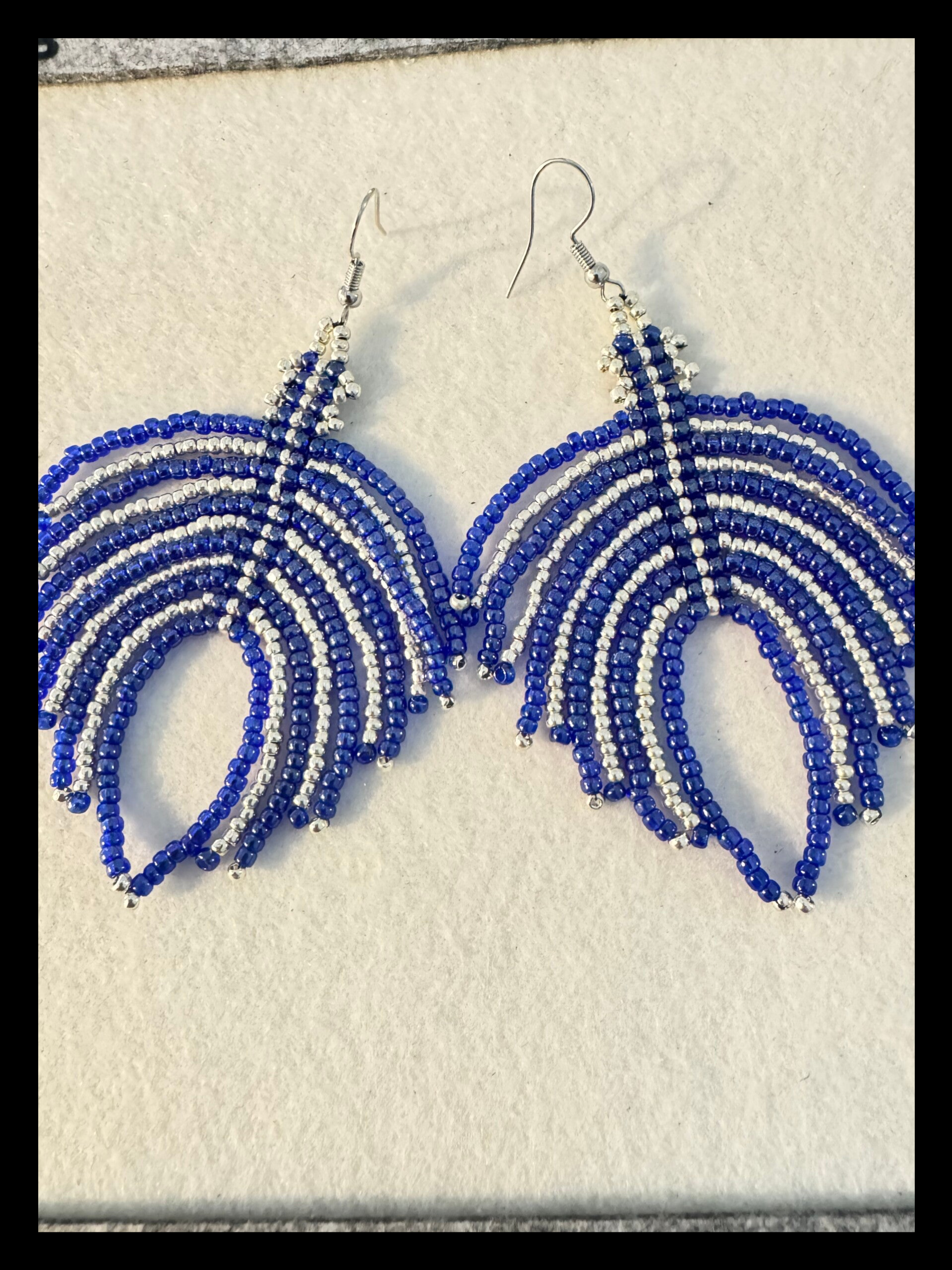 Diese handgefertigten Ohrringe in intensiven Blautönen erinnern an Tiefe, Klarheit und innere Ruhe. Die feinen, beweglichen Linien verleihen dem Design Leichtigkeit und Dynamik, während die Kombination aus Blau und silberfarbenen Akzenten für eine moderne, edle Ausstrahlung sorgt.