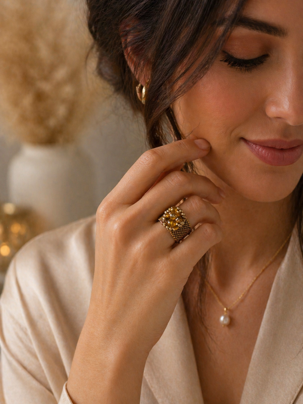 Die harmonische Kombination aus Struktur und Licht verleiht diesem handgefertigten Schmuckstück eine besondere Tiefe und Ausstrahlung. Jeder Ring ist ein Unikat und steht für Stil, Wärme und feminine Eleganz.