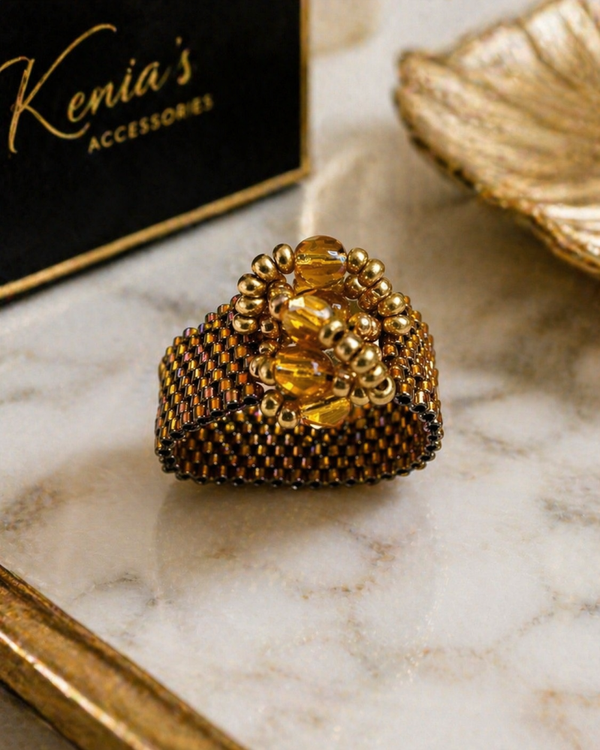 Der Goldene Aura Ring vereint schimmernde Brauntöne mit edlen goldfarbenen Perlen und einem strahlenden Zentrum, das sofort alle Blicke auf sich zieht.